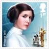 Stamp: Princess Leia, with R2D2 and C3PO in the corner.