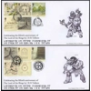 We produced two pairs of FDCs for this set of 10. In each case one cover has stamps depicting 'evil' and one has the 'good' stamps. One pair is in pencil/charcoal by Mates Laurentiu showing with a goblin marauder on one cover and a dwarven warrior on the other.